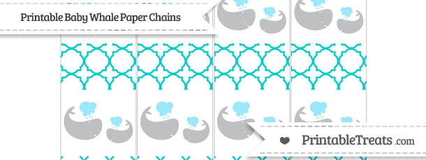 Decorating for a whale themed baby shower? Print out these fun free robin egg blue quatrefoil pattern baby whale paper chains and link them together for an easy whale theme decoration.