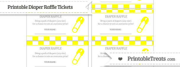 Here are some cute yellow checker pattern diaper pin diaper raffle tickets you can print, cut, and send to guests along with your baby shower invitations.
